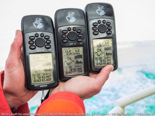 The World private residential Ship (aboardtheworld.com) has broken the record for the most southerly navigation reaching 78°43•997´S and 163°41•421´W at the Bay of Whales in Antarctica’s Ross Sea. The World recorded this polar record at 10:41hrs Ship’s time (New Zealand time) on 28th January 2017. M/V The World is a 43,188-ton private yacht commanded by Captain Dag H. Saevik. Carrying 145 Residents & Guests and 272 Crew adventurers, this is now the furthest south any vessel has ever sailed.