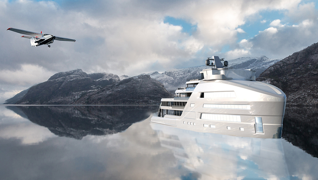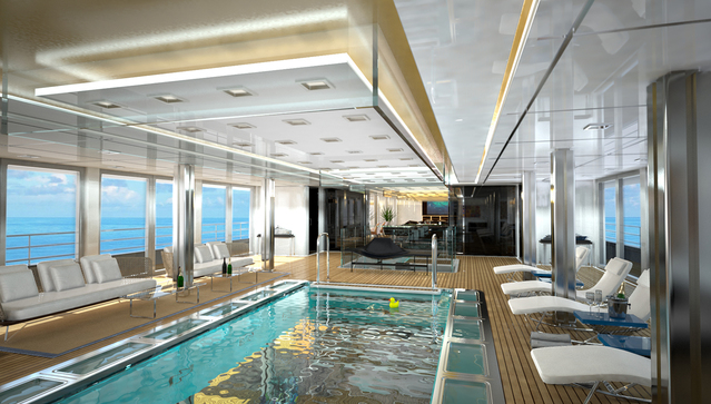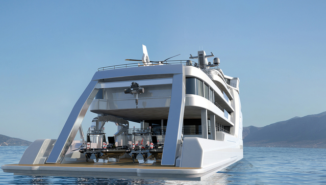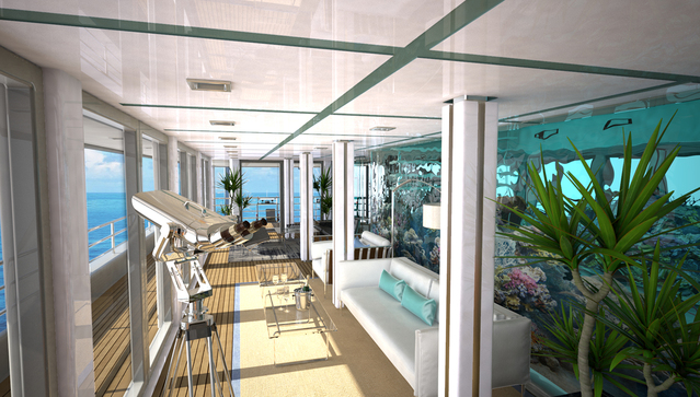 Highlights of this futuristic-looking yacht include a full-size, swimming pool flanked by a lounging area protected by glass walls for uninterrupted views and weather insulation while taking a dip. Taboo’s plans also call for two Jacuzzis, a gym and spa area, and an aft summerhouse that can be used for anything from an extra stateroom to a lounge or casino. The owner will enjoy his or her own deck that includes a private lounge, outdoor space, and offices. A helicopter landing pad and accompanying retractable, enclosed helicopter garage ensure guests easy access to the yacht from wherever they might be arriving. And tender garages on the bottom deck can accommodate any type of tender up to 46 feet. The firm suggests stowing your personal submarine or amphibious car, a plane, or even a hot-air balloon for exploring once you drop anchor.