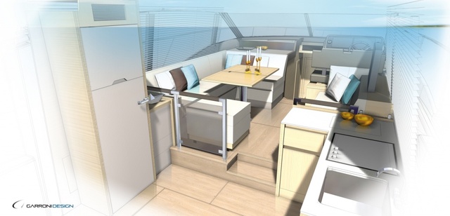 The new L-shape cockpit, wide and open, offers an access to the skipper cabin. Centered galley, 360° vision and incredible brightness are the main features of the main deck. The wide vis-à-vis salon is all on the same level. The pilot station offers a new modern style dashboard.