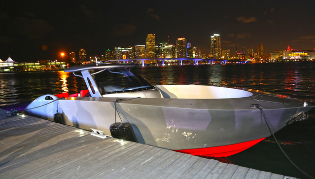 One of the most interesting—and definitely one of the fastest—yachts at the Miami boat show in the Miami Marine Stadium Park and Basin was the SV Alpha. The 38-footer, with its flared silver hull and lollipop-red interior, was inspired by the lines of a 1967 Corvette. The designers Mauricio Velez and Nicolai Sass decided to build their own boat after a visit to an earlier Miami show. “We were bored with what we saw,” says Velez. “Everything was the same. We just looked at each other and said, ‘Why don’t we build our own hotrod boat?’”