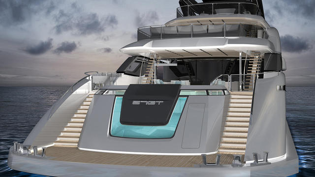 Floor-to-ceiling glazing in the main deck saloon, master suite and upper deck saloon maximise both views and light, but the star of the show is the aft deck superyacht pool with a U-shaped glass panel built into the transom to create a real wow factor as guests step on board.