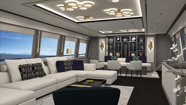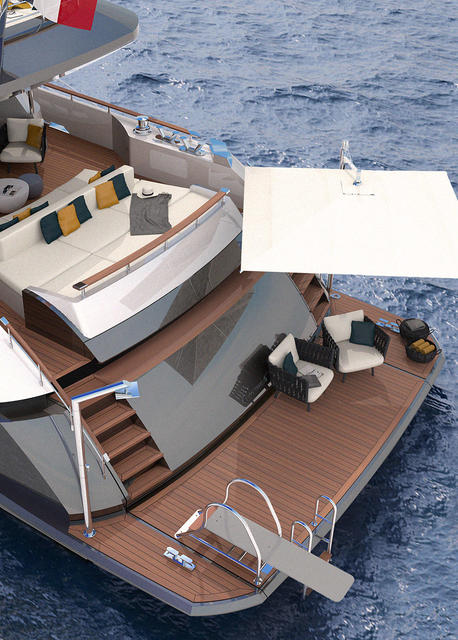 Back aft, the transom would be fitted with a spacious bathing platform, complete with a shower, parasol, diving board and swimming ladder, while the sheltered cockpit is just a few short steps away.