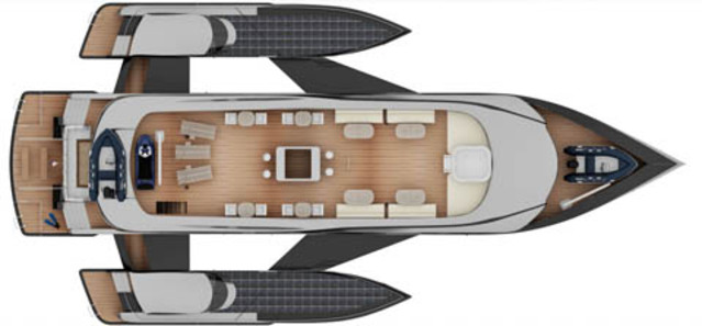 The trimaran has 13 comfortable cabins for guests on a main vessel; cabins for 12 crew members are located in floats. In consequence, guests and crew are in different spaces and do not interfere each other. Everyone has its own private and comfortable recreation area.