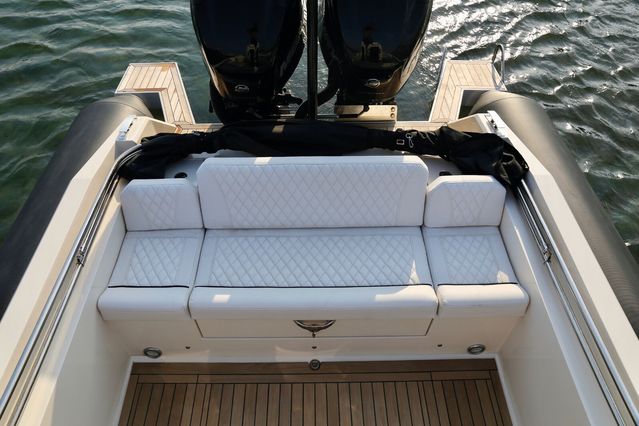 Length overall is 9.05 meters, and the beam is 3 meters. The RIB displaces 1,750 kg and offers a layout that emphasizes simplicity and ergonomics. The forward part features a sun bed that continues aft along the tubes. Amidships is the ergonomic console with a full compliment of instruments, and includes the possibility to mount a Smart Central Consol Touchscreen and a sporting T-Top. The pilot and a guest have two wrap-around shock-absorbing seats, ideal for a RIB that can reach speeds over 70 mph*.