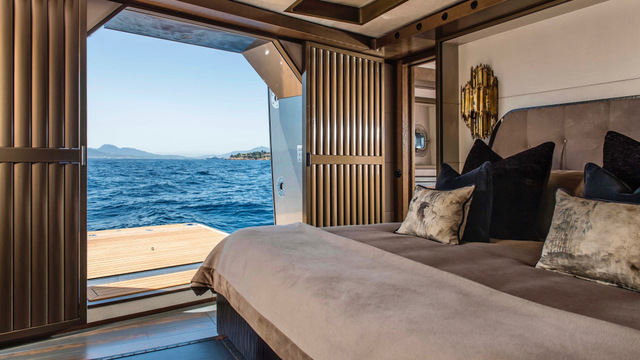 These details are just hints of the pleasure palace inside the carbon-fiber hull. Elegant, organized chaos might be the best way to describe Pink Gin VI’s interior, with arguably the most unusual collection of features and materials of any yacht that launched at the Monacoshow.