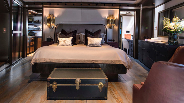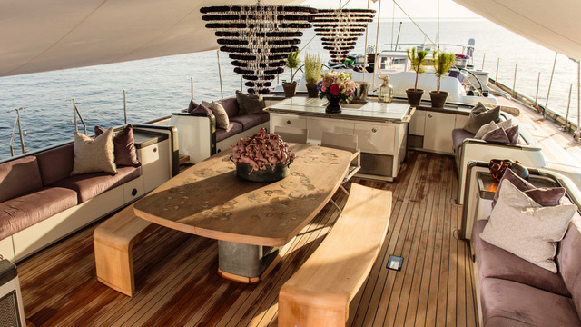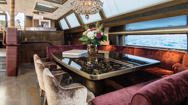 The 175-foot sailing yacht Pink Gin VI is a long, lithe beauty. The latest launch from Baltic Yachts is noteworthy for being the world’s largest carbon-fiber sloop, with upwind sails of more than 14,000 square feet, and capable of reaching speeds of 30 knots. Pink Gin is a strong, stable-looking yacht with twin cockpits that stand out for their purple-cushioned seats. A closer look reveals pewter furniture that weathers gracefully, a capstan made of ancient bog oak and pewter, and crystal chandeliers that hang from the boom during social events.