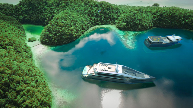 Rolls-Royce is best known for its luxury cars, but another division specializes in high-tech propulsion systems for superyachts, jets, and even space shuttles. The company introduced a bold new concept called Crystal Blue, which marries a 12-guest, 203-foot superyacht to a state-of-the-art hybrid power system. To up the ante, the design team also included a 138-foot remote-controlled support vessel called Blue Shadow as yachting’s coolest dynamic duo.