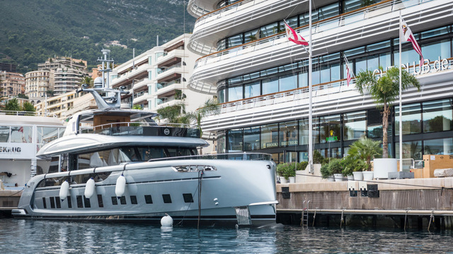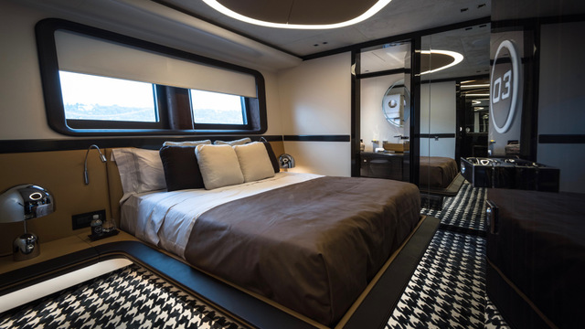 Beyond its technical prowess the GTT 115 is also a yacht imbued with the “design spirit” of Studio F.A. Porsche. Most of the design cues implemented by Studio F.A. Porsche are understated and elegant, including the Pepita houndstooth fabric in the interior and in sections of the exterior. This same fabric pattern was used in the Porsche 911 series in the 1970s. This pattern has been offset with high-gloss Macassar ebony veneers, dark-brown saddle leather, Alcantara, Persian carpets, and a rare Sahara Noir marble.