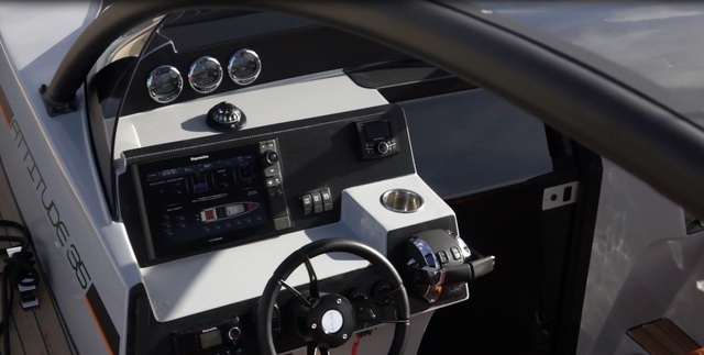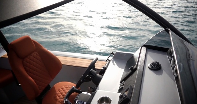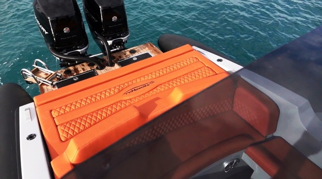 This demo is loaded with options as you can see from the list below. The colour scheme chosen (see attached photos) is both modern and aggressive, a perfect match for this vessel, combining a black hull with a silver deck and orange upholstery.