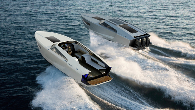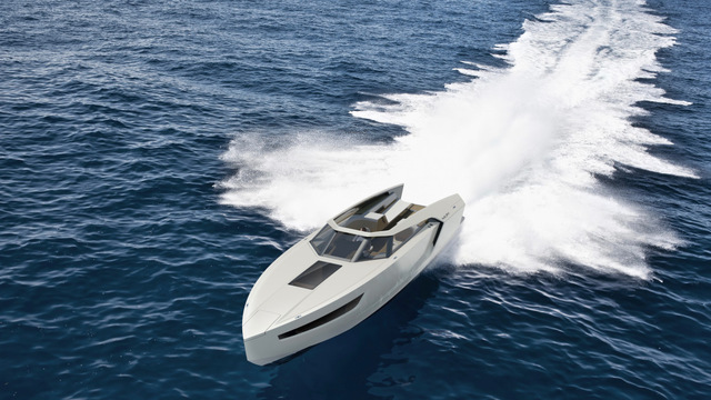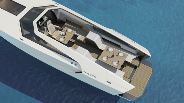 The Swedish builder was launching its open version last week at the Stockholm boat show. The new GTO 42 is as trendy as its closed-back cousin, with a tall windshield over the helm that transitions into side walls all the way back to the transom. At the rear end of the cockpit are twin lounges on both sides that allow the guests to either sit and talk, or just lie down and watch the rooster tail in the wake behind. The open-transom design also makes the water immediately accessible. Like the GT 42, the GT42O has a sci-fi helm with a wheel that is circular and rectangular, touch-screen consoles, and a single helm seat for the driver.