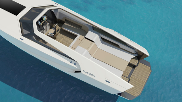 Red Design cherry-picked different elements of supercar design to create the GTO 42, including air scoops that funnel fresh air into the forward cabin and engine room, sculpted windows, and even what look like taillights at the stern. The boat is built for speed, with a stepped hull, lightweight carbon-fiber layup, and choice of inboard engines from Volvo or MerCruiser. With 430 hp gas inboards, the Superfly has a top end of 50 knots. With diesels, it’s closer to 45 knots.