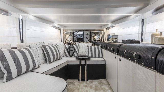 After a chance meeting between Fendi and Grande, and realization that they had similar creative objectives, the idea for the Special Edition was born. At 37 feet, the yacht was initially conceived as a luxury dayboat for overnight cruising, but could also be used as a tender for a larger yacht or as a chase boat. Looking to add something a little bit more to the original 2016 model, Fendi was the perfect fit. As Grande comments, “The resulting alchemy combined both our styles in perfect harmony and the end product is a truly beautiful yacht that responds to a specific niche in the market.”